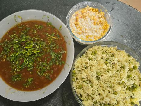 • North Indian Thali: Dal makhni or kadhi + Chole or baingan bharta or rajma + Peas pulao + Roti or poori + Halwa or kheer